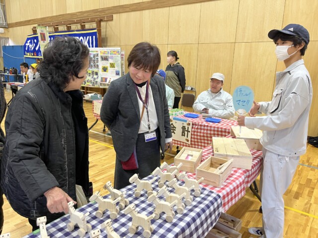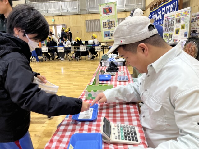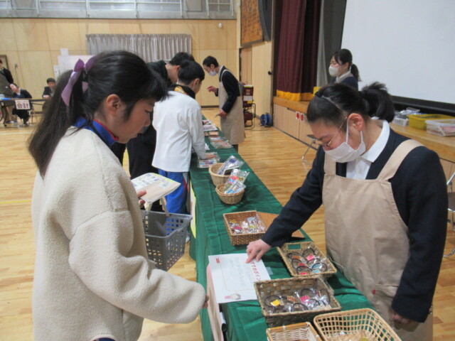令和8年2月9日(月)~10日(火)の2日間、本校体育館において「きりの子バザール」を行いました。中学部と高等部が作業学習で制作した製品を本校児童生徒や保護者、地域の方々、学校評議員の方々に販売しました。今年度の木工班の製品は、PCデスク、ティッシュBOX、踏み台、ウマカーズ(馬のおもちゃ)、キーホルダー、チェアー、ブックシェルフ、ペン立て、カッティングボード、置き時計、パタパタおもちゃ、キャスターボードなど、多種多彩な品揃えでした。手工芸班の製品は、ビーズアクセサリー、小物入れ、メモ帳、ポーチ、各種トレー、卓上カレンダー、鍋敷き(木工班とのコラボ製品)、エプロン、クッションなど、さをり織り製品とクラフト製品の2種目の手工芸品を販売しました。丹精込めてお客様のために作った製品はみごと完売し、仲間と協働しながら取り組んできた成果が実を結んだ瞬間でした。