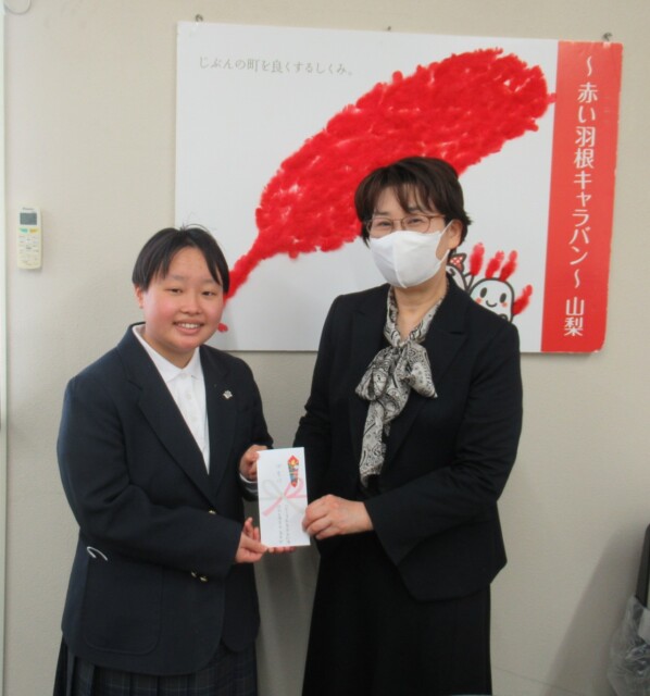 高等部では、作業学習の授業で木工班と手工芸班が作った製品を7月のマルシェや2月のバザールで販売しています。その売上金は、自分達の給料として販売会での買い物代や食事会の費用として使ったり、学部のみんなで楽しめる物(本やDVD、健康器具、ゲーム機等)の購入費になったりしています。また、生徒達から売上金を「今年も募金したい!」という意見があがりました。そこで、高等部の生徒を代表して、仲よし会副会長が令和8年2月24日に福祉プラザを訪問し、売上金の一部を寄付して参りました。ぜひ、「町をよくするしくみ」に役立てていただきたいです。