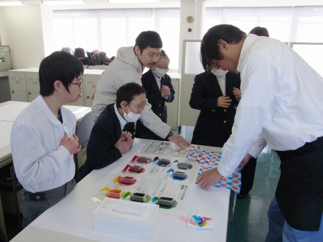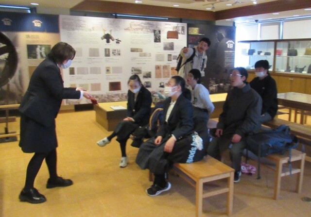 印伝屋では、事前に学習していた鹿革のことや漆付け、燻(ふすべ)などの技法について、実物を手に取って触り心地や匂いなどを確かめながら学びを深めることができました。