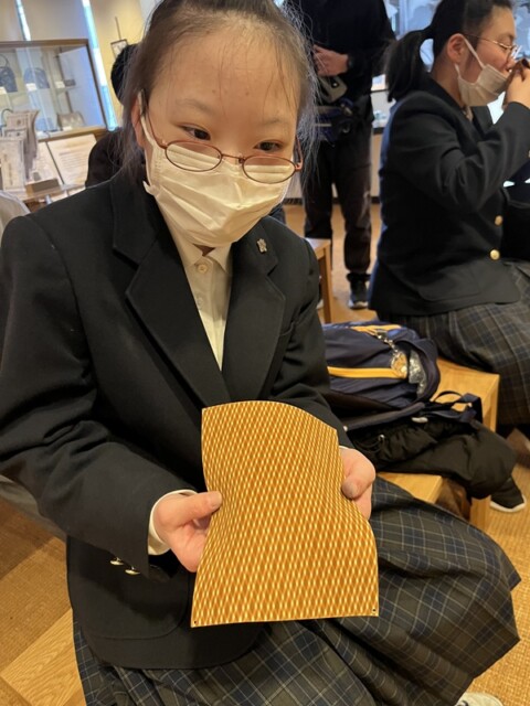 一秀製紙工場では和紙のおり染めに挑戦し、優しい社長さんたちの説明を聞きながら自分でも驚くほどのきれいな仕上がりに笑顔があふれ、心に残る体験ができました。