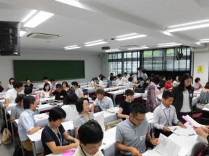 後半は,10グループに分かれての意見交換を行いました。グループごとに選んだ事例について,活発な意見交換が行われました。全体での意見交換の場では,本校の事例発表もあり,実際に本校の指導で用いている教材を紹介したり,授業の様子を動画で紹介したりしました。
