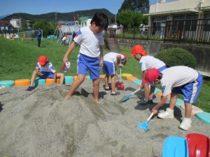 スコップで穴を掘ったり,山をつくったり,食器を使っておままごとをしたりと,思い思いの遊び方で楽しむ様子が見られました。