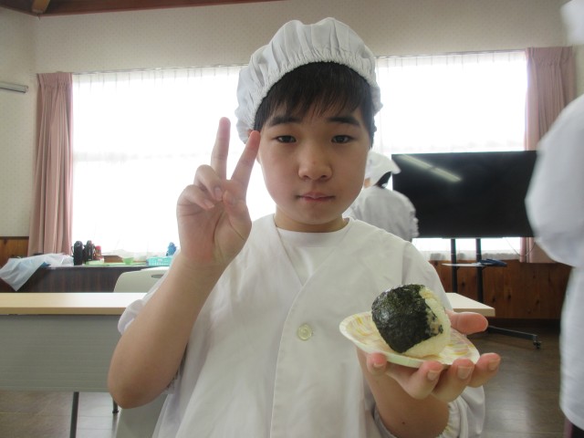 前週の授業で、柔らかい紙粘土をご飯に見立てて、三角おにぎりを作れるように練習しました。握り方を工夫したり、手順表で確認しながら進めたりと、皆集中して取り組みました。その練習の成果が出て、上手におにぎりを作ることができました。各自がご飯の中にシーチキンマヨネーズや昆布を入れたり、ふりかけをかけたりして、自分好みのおにぎりにしました。海苔をまく生徒もいて、どのおにぎりもおいしそうに出来上がりました。自分で作ったおにぎりを食べて、みんな満足げな表情を見せていました。