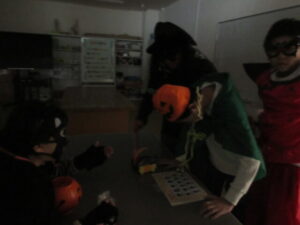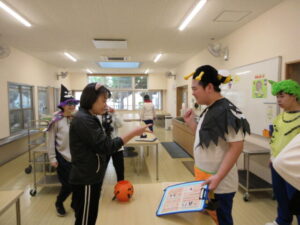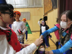 10月31日(金)に外国語活動でハロウィンの体験をしました。自分たちで選んだ仮装をして体育館に集合しました。授業の始めは、中学部のみんなで英語の歌を歌ったり、ALTとあいさつをしたりしました。その後、前回の授業で作成した猫のバスケットを持って、学校を練り歩きました。校内には3カ所、ミッションが課された場所があり、まず「Trick or Treat」と合い言葉を伝え、各場所で「Rock, paper, scissors」「What’s your name?」「Who are you?」のいずれかの質問に対して答えられたらお菓子がもらえました。生徒たちは、「Thank you.」と返して、嬉しそうな表情を見せていました。今まで学習した英語の表現を使いながら、外国の文化を楽しむことができました。