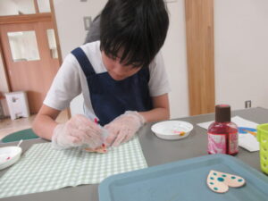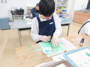 革製品作りでは、刻印打ち・色さし・色ぬり・ワックスかけという4つの工程を分業で行っています。生徒一人ひとりが自分の役割を理解し、少しずつ上達してきており、自分が担当する作業が終わった後は、次の工程を担当する生徒に報告することも忘れないようにしています。きりの子バザールに向けて、心を込めて製品作りに取り組んでいます。