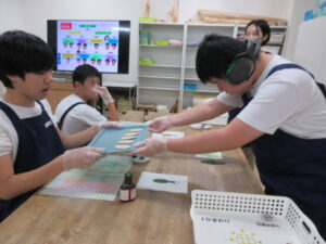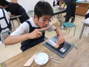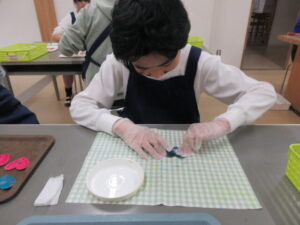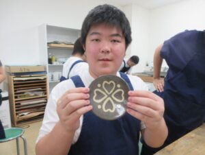 後期の作業学習では、革製品作りに取り組んでいます。オリエンテーションでは、前期に製作した模様皿の完成品を見ました。焼き上がったきれいな皿を手に取り、生徒たちはとても満足な様子でした。その後、革製品作りの工程を確認し、実際の作業に入っていきました。