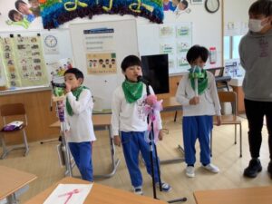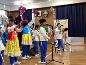 小学部では今年も、11月4日にオカリナ奏者の柿内美緒さんをお迎えして、『音楽会』を行いました。『音楽会』は毎年さまざまな楽器の演奏家の方をお招きし「季節のお話し」として『11月のわくわく集会』の中で行っています。今年は演奏を聴くだけでなく、「お礼に自分たちも発表しよう!」と『友だちになろうよ』を歌いました。ダンス・歌・楽器の3グループに分かれて準備も頑張りました。手作りの「Myマイク」や「My楽器」、それに衣装や振り付けも考えて、「観る・聴く・演奏する」の楽しい『音楽会』になりました。