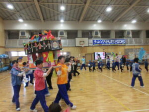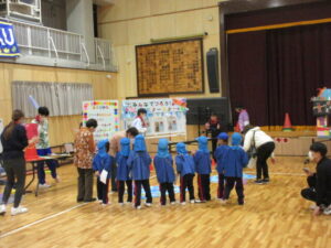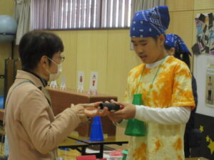 今回の地域交流では、新紺屋地区のシニアクラブの皆さまと附属幼稚園の年長さんをお招きし、「なかまコラボ☆フェスティバル」 を開催しました。子どもたちは、これまで一生懸命練習してきた歌やダンスを披露し、一緒に体を動かしながら楽しい時間を過ごしました。また、お店屋さんでは、中学部の生徒が店員役となり、来てくださった皆さまにさまざまな遊びを楽しんでいただきました。会場には、子どもたちの笑顔、遊びに夢中になる姿、そして地域の皆さまのあたたかな表情があふれ、とてもすてきな交流のひとときとなりました。