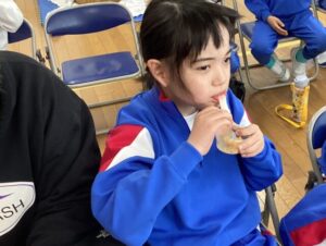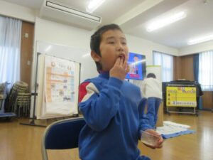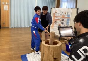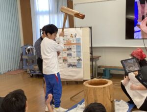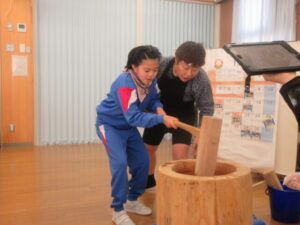 1月9日にわくわく集会で餅つきを行いました。杵と臼を使い、一人ずつお餅をぺったんことついていきました。子どもたちにとっては重たい杵でしたが、みんな嬉しそうに餅をつくことができました。今年はできたてのお餅をその場で食べました。きなこや醤油で味付けしたお餅をもらいみんなで食べました。とても美味しく、たのしいわくわく集会になりました。