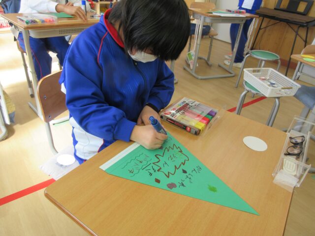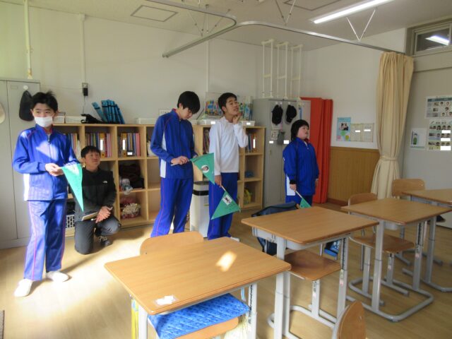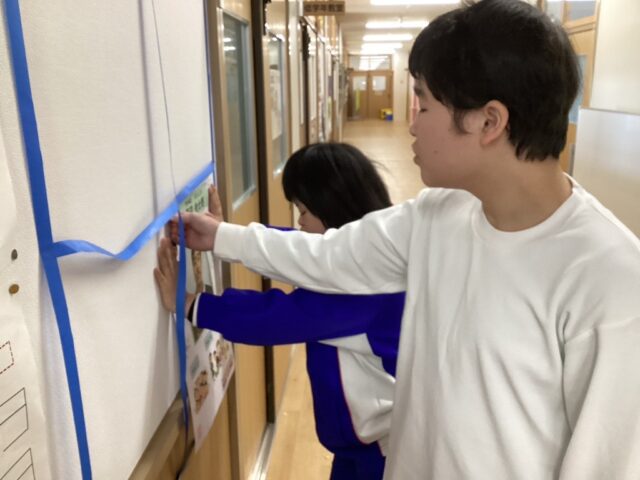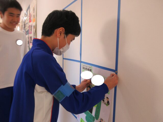 どのような生徒が副会長としてふさわしいかを学級で話し合って候補者を決め、学級全員で応援していくことを確認しました。選挙運動に向けて、どのような学校にしていきたいかを考えたり、ポスターや選挙運動に必要な応援旗やのぼりなどのグッズを協力して作ったりしました。